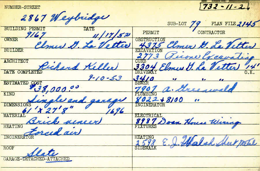 2867 Weybridge Road Shaker Heights, OH 44120 PARCEL ID: 732-11-002 Building Permit Date: 11-17-1952 Plan File Number: 2145 scanned Microfilm Roll: Roll#32 Owner: La Vetter, Elmer G. Architect: Keller, Richard A. Estimated Cost: 38000 Date Completed: 09-10-1953 Kind: Single Dwelling and Garage Material: Brick Veneer Heating: Forced Air Roof: Slate Garage: attached |