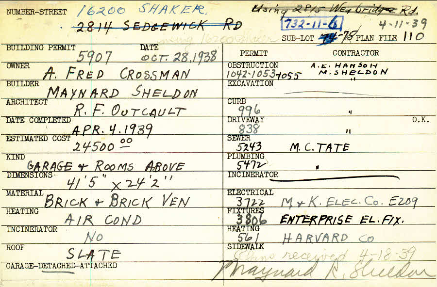 16200 Shaker Boulevard Shaker Heights, OH 44120 PARCEL ID: 732-11-006 Building Permit Date: 10-28-1938 Plan File Number: 110, 10722 Microfilm Roll: NewRoll#5 Neighborhood: Boulevard Owner: Crossman, A. Fred Builder: Sheldon, Maynard Architect: Outcalt, R. F. Estimated Cost: 24500 Date Completed: 04-04-1939 Material: Brick and Brick Veneer Heating: Air Conditioned Roof: Slate Garage: detached |