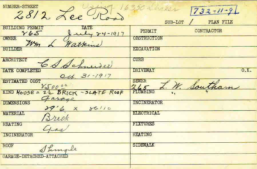 2812 Lee Road Shaker Heights, OH 44120 PARCEL ID: 732-11-009 Building Permit Date: 07-24-1917 Plan File Number: 0 Owner: Watkins, William L. Architect: Schneider, C.S. Estimated Cost: 2500 Date Completed: 10-31-1917 Material: Brick Heating: Forced Air - Gas Roof: Shingles Card Available: Yes |  |