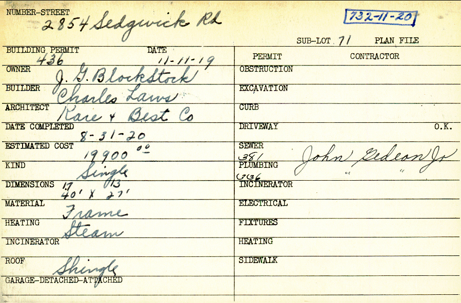 2854 Sedgewick Road Shaker Heights, OH 44120 PARCEL ID: 732-11-020 Building Permit Date: 11-11-1919 Plan File Number: 0 Neighborhood: Boulevard Owner: Blockstock, J. G. Builder: Laws, Charles Architect: Kare and Best Company Estimated Cost: 19900 Date Completed: 08-31-1920 Kind: Single, Single Residence or Dwelling Material: Frame Heating: Steam Roof: Shingles |