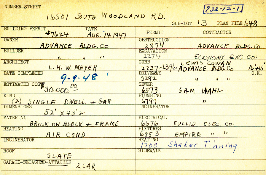 16501 South Woodland Road Shaker Heights, OH 44120 PARCEL ID: 732-12-001 Building Permit Date: 08-14-1947 Plan File Number: 648 scanned, 5662 Microfilm Roll: Roll008, Roll#76 Owner: Advance Building Company Builder: Advance Building Company Architect: Meyer, L. H. W. Estimated Cost: 30000 Date Completed: 09-09-1948 Kind: Single Dwelling and Garage (2) Material: Brick on Block and Frame Heating: Air Conditioned Roof: Slate Garage: attached 2 car |