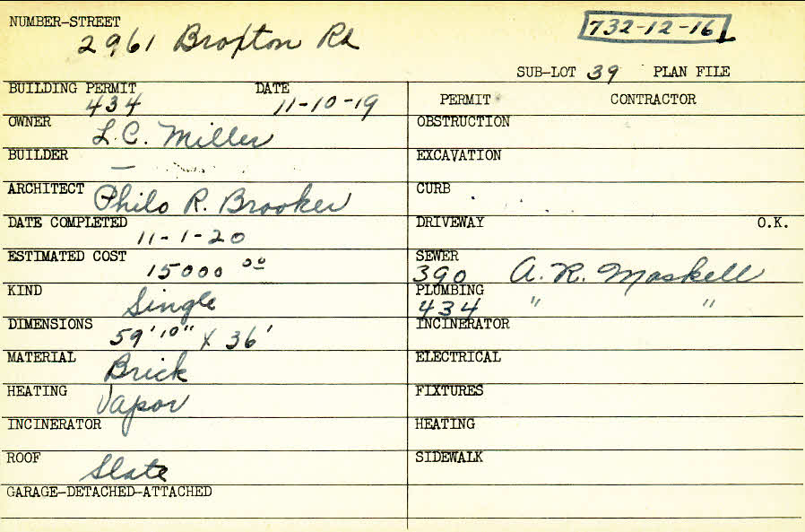 2961 Broxton Road Shaker Heights, OH 44120 PARCEL ID: 732-12-016 Building Permit Date: 11-10-1919 Plan File Number: 0 Owner: Miller, L. C. Architect: Brooke, Philo R. Estimated Cost: 15000 Date Completed: 11-01-1920 Kind: Single, Single Residence or Dwelling Material: Brick Heating: Vapor Roof: Slate |