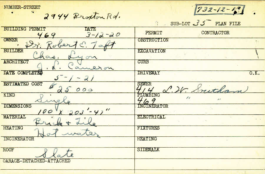 2944 Broxton Road Shaker Heights, OH 44120 PARCEL ID: 732-12-018 Building Permit Date: 03-12-1920 Plan File Number: 0 Neighborhood: Boulevard Owner: Taft, Dr. Robert E. Builder: Lyon, Charles Architect: Cameron, J. L. Estimated Cost: 25000 Date Completed: 05-01-1921 Kind: Single, Single Residence or Dwelling Material: Brick and Tile Heating: Hot Water Roof: Slate |