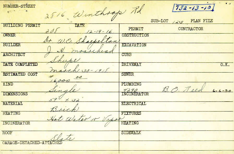 2816 Winthrop Road Shaker Heights, OH 44120 PARCEL ID: 732-13-010 Building Permit Date: 12-19-1916 Plan File Number: 93-52* Microfilm Roll: NewRoll#16 Neighborhood: Boulevard Owner: Shaepelton, Dr. W. E. Builder: Moorehead, J. H. Architect: Shupe Estimated Cost: 16000 Date Completed: 03-30-1918 Kind: Single, Single Residence or Dwelling Material: Brick Heating: Hot Water Roof: Slate |