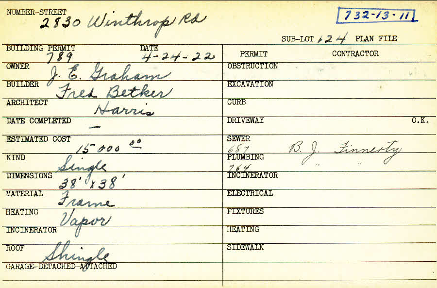 2830 Winthrop Road Shaker Heights, OH 44120 PARCEL ID: 732-13-011 Building Permit Date: 04-24-1922 Plan File Number: 5276 Microfilm Roll: Roll#72 Neighborhood: Boulevard Owner: Graham, J. E. Builder: Betker, Fred Architect: Harris Estimated Cost: 15000 Kind: Single, Single Residence or Dwelling Material: Frame Heating: Vapor Roof: Shingles |