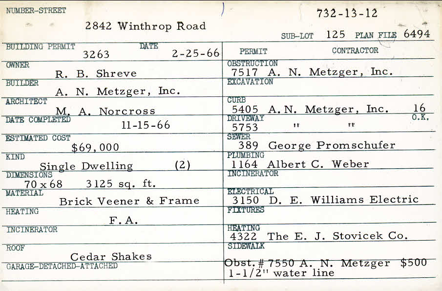 2842 Winthrop Road Shaker Heights, OH 44120 PARCEL ID: 732-13-012 Building Permit Date: 02-25-1966 Plan File Number: 6494 Microfilm Roll: Roll#86 Neighborhood: Boulevard Owner: Shreve, R. B. Builder: A. N. Metzger, Inc. Architect: Norcross, M. A. Estimated Cost: 69000 Date Completed: 11-15-1966 Kind: Single, Single Residence or Dwelling (2) Material: Brick Veneer and Frame Heating: Forced Air Roof: Wood Shakes |