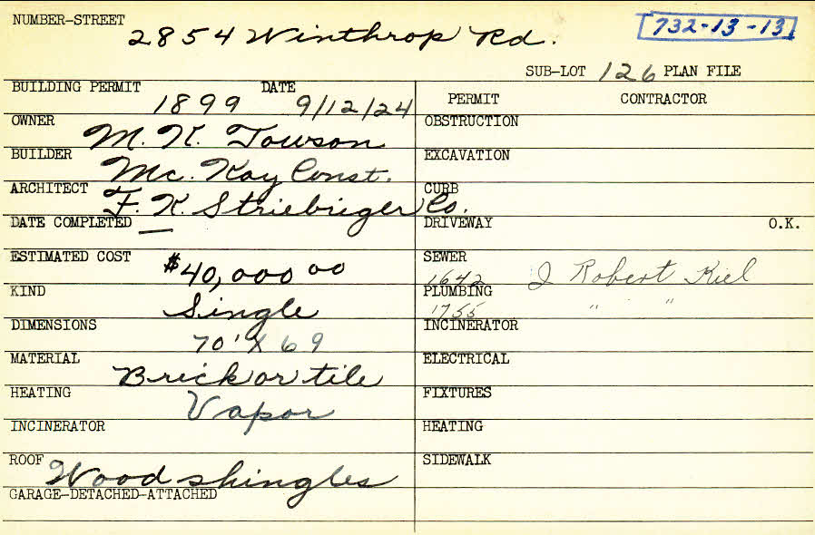 2854 Winthrop Road Shaker Heights, OH 44120 PARCEL ID: 732-13-013 Building Permit Date: 09-12-1924 Plan File Number: 10375 Microfilm Roll: NewRoll#3 Neighborhood: Boulevard Owner: Towson, M. H. Builder: McKay Construction Architect: F. K. Striebriger Company Estimated Cost: 40000 Kind: Single, Single Residence or Dwelling Material: Brick or Tile Heating: Vapor Roof: Wood Shingle |