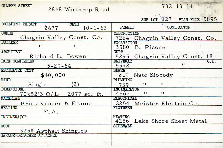 2868 Winthrop Road Shaker Heights, OH 44120 PARCEL ID: 732-13-014 Building Permit Date: 10-01-1963 Plan File Number: 5895 Microfilm Roll: Roll#79 Neighborhood: Boulevard Owner: Chagrin Valley Construction Company Builder: Chagrin Valley Construction Company Architect: Bowen, Richard L. Estimated Cost: 40000 Date Completed: 05-29-1964 Kind: Single, Single Residence or Dwelling (2) Material: Brick Veneer and Frame Heating: Forced Air Roof: 325# Asphalt |