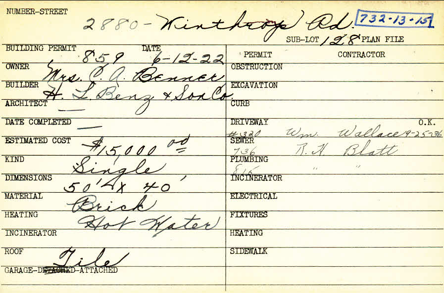 2880 Winthrop Road Shaker Heights, OH 44120 PARCEL ID: 732-13-015 Building Permit Date: 06-12-1922 Plan File Number: 1623 scanned, 4527 Microfilm Roll: Roll025, Roll#63 Neighborhood: Boulevard Owner: Benner, Mrs. C. A. Builder: H. L. Benz and Son Company Estimated Cost: 15000 Kind: Single, Single Residence or Dwelling Material: Brick Heating: Hot Water Roof: Tile Garage: attached |