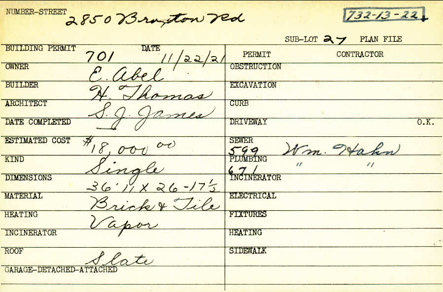 2850 Broxton Road Shaker Heights, OH 44120 PARCEL ID: 732-13-022 Building Permit Date: 11-22-1921 Plan File Number: 0 Neighborhood: Boulevard Owner: Abel, E. Builder: Thomas, H. Architect: James, S. J. Estimated Cost: 18000 Kind: Single, Single Residence or Dwelling Material: Brick and Tile Heating: Vapor Roof: Slate |