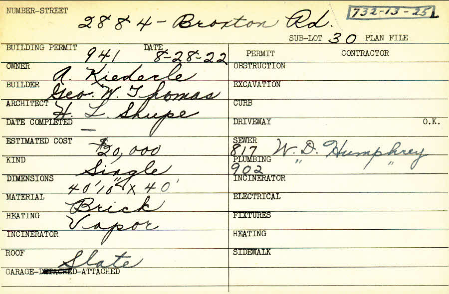 2884 Broxton Road Shaker Heights, OH 44120 PARCEL ID: 732-13-025 Building Permit Date: 08-28-1922 Plan File Number: 11834 all scanned Microfilm Roll: NewRoll09 Owner: Kiederle, A. Builder: Thomas, George W. Architect: Shupe, Harry L. Estimated Cost: 20000 Kind: Single, Single Residence or Dwelling Material: Brick Heating: Vapor Roof: Slate Garage: attached Blueprints: online, see link above |