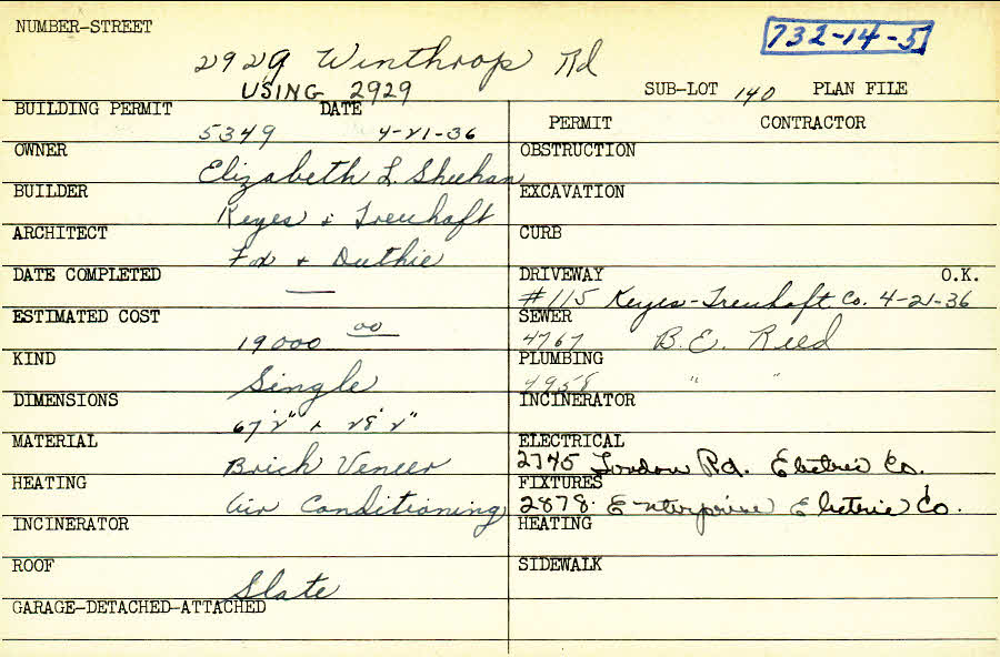 2929 Winthrop Road Shaker Heights, OH 44120 PARCEL ID: 732-14-005 Building Permit Date: 04-21-1936 Plan File Number: 0 Neighborhood: Boulevard Owner: Sheehan, Elizabeth L. Builder: Keys and Treuhaft Architect: Fox and Duthie Estimated Cost: 19000 Kind: Single, Single Residence or Dwelling Material: Brick Veneer Heating: Air Conditioned Roof: Slate |