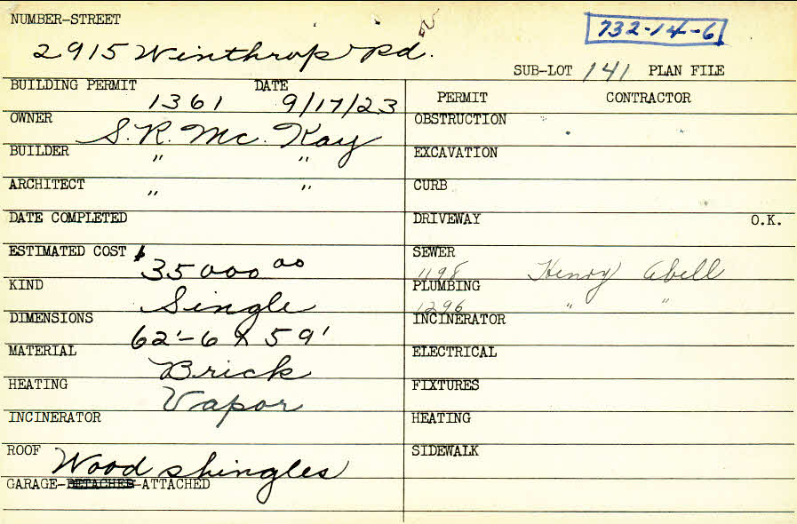2915 Winthrop Road Shaker Heights, OH 44120 PARCEL ID: 732-14-006 Building Permit Date: 09-17-1923 Plan File Number: 7268 Microfilm Roll: Roll#92 Neighborhood: Boulevard Owner: McKay, S. R. Builder: McKay, S. R. Architect: McKay, S. R. Estimated Cost: 35000 Kind: Single, Single Residence or Dwelling Material: Brick Heating: Vapor Roof: Wood Shingle Garage: attached |