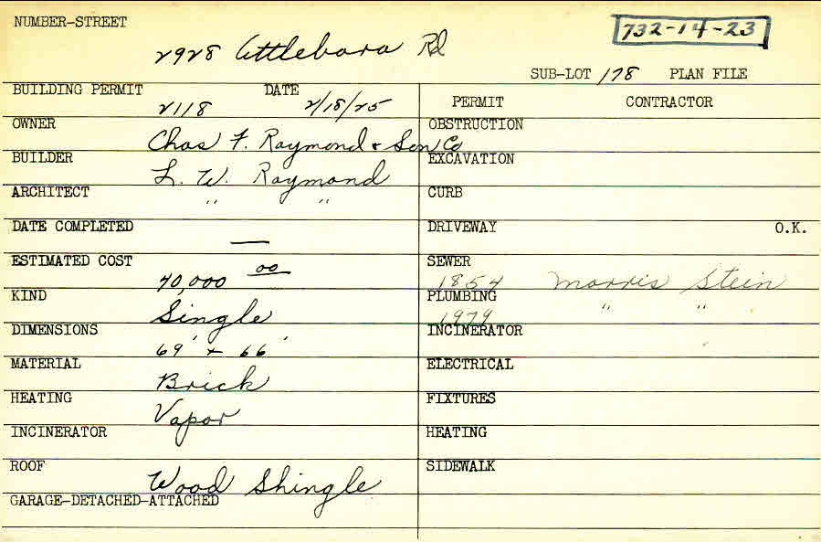2928 Attleboro Road Shaker Heights, OH 44120 PARCEL ID: 732-14-023 Building Permit Date: 02-18-1925 Plan File Number: 2697 Microfilm Roll: Roll #37 Neighborhood: Malvern Owner: Charles F. Raymond and Son Company Builder: Raymond, Lawrence W. Architect: Raymond, Lawrence W. Estimated Cost: 40000 Kind: Single, Single Residence or Dwelling Material: Brick Heating: Vapor Roof: Wood Shingle |