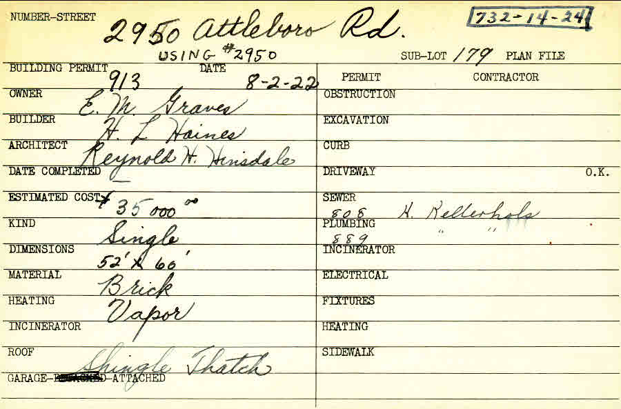 2950 Attleboro Road Shaker Heights, OH 44120 PARCEL ID: 732-14-024 Building Permit Date: 08-02-1922 Plan File Number: 0 Neighborhood: Malvern Owner: Graves, E. M. Builder: Haines, H. L. Architect: Hinsdale, Reynold H. Estimated Cost: 35000 Kind: Single, Single Residence or Dwelling Material: Brick Heating: Vapor Roof: Shingles Garage: attached Card Available: yes |