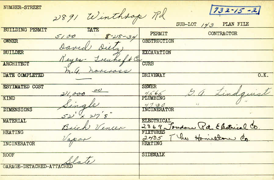 2891 Winthrop Road Shaker Heights, OH 44120 PARCEL ID: 732-15-002 Building Permit Date: 08-28-1934 Plan File Number: 0 Neighborhood: Boulevard Owner: Dietz, David Builder: Keyes-Treuhaft Company Architect: Norcross, M. A. Estimated Cost: 21000 Kind: Single, Single Residence or Dwelling Material: Brick Veneer Heating: Vapor Roof: Slate |