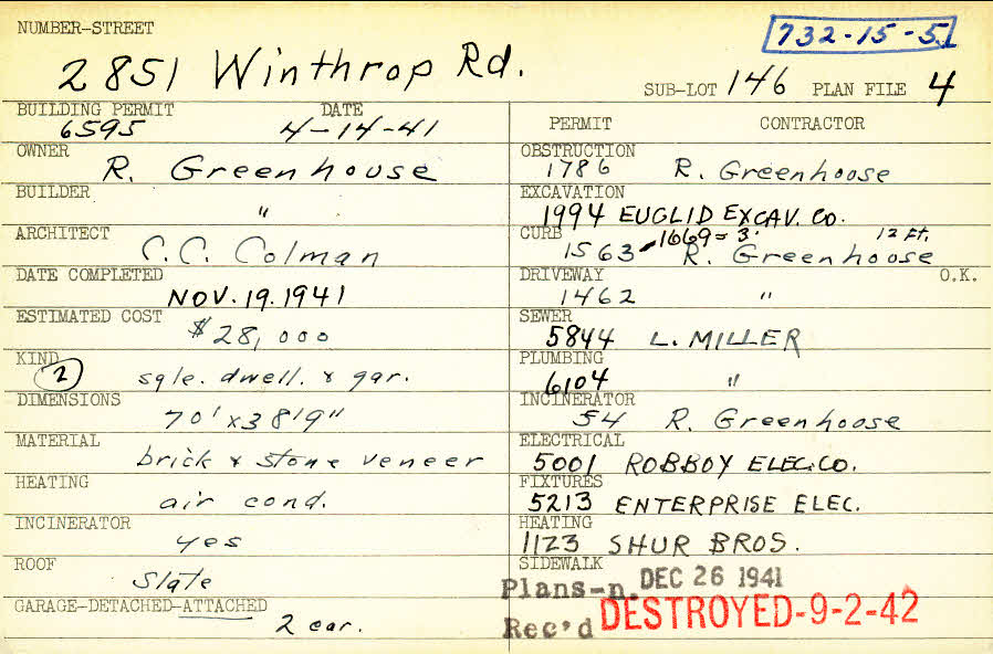 2851 Winthrop Road Shaker Heights, OH 44120 PARCEL ID: 732-15-005 Building Permit Date: 04-14-1941 Neighborhood: Boulevard Owner: Greenhouse, R. Builder: Greenhouse, R. Architect: Colman, Charles C. Estimated Cost: 28000 Date Completed: 11-19-1941 Kind: Single Dwelling and Garage (2) Material: Brick and Stone Veneer Heating: Air Conditioned Roof: Slate Garage: attached 2 car Blueprints: no blueprints on microfilm |