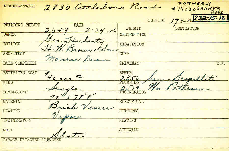 2830 Attleboro Road Shaker Heights, OH 44120 PARCEL ID: 732-15-018 Building Permit Date: 02-24-1926 Plan File Number: 0 Neighborhood: Malvern Owner: Huberty, George Builder: H. W. Brown and Son Architect: Dean, Monroe Estimated Cost: 40000 Kind: Single, Single Residence or Dwelling Material: Brick Veneer Heating: Vapor Roof: Slate Card Available: yes |