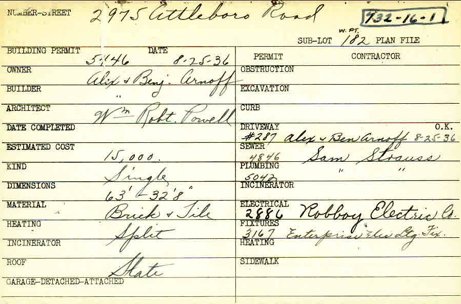 2975 Attleboro Road Shaker Heights, OH 44120 PARCEL ID: 732-16-001 Building Permit Date: 08-25-1936 Plan File Number: 0 Neighborhood: Malvern Owner: Arnoff, Alex and Benjamin Builder: Arnoff, Alex and Benjamin Architect: Powell, William Robert Estimated Cost: 15000 Kind: Single, Single Residence or Dwelling Material: Brick and Tile Roof: Slate Card Available: yes |