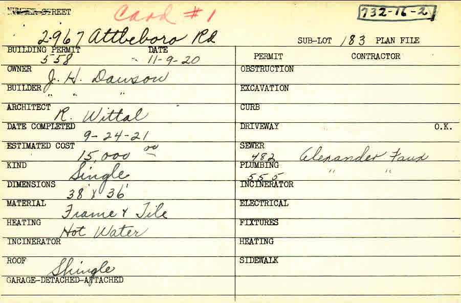 2967 Attleboro Road Shaker Heights, OH 44120 PARCEL ID: 732-16-002 Building Permit Date: 11-09-1920 Plan File Number: 0 Neighborhood: Malvern Owner: Dawson, J. H. Builder: Dawson, J. H. Architect: Wittal, R. Estimated Cost: 15000 Date Completed: 09-24-1921 Kind: Single, Single Residence or Dwelling Material: Frame and Tile Heating: Hot Water Roof: Shingles |