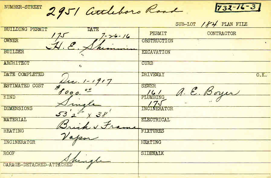 2951 Attleboro Road Shaker Heights, OH 44120 PARCEL ID: 732-16-003 Building Permit Date: 07-26-1916 Plan File Number: 0 Neighborhood: Malvern Owner: Shimmin, H. E. Builder: Shimmin, H. E. Architect: Shimmin, H. E. Estimated Cost: 8000 Date Completed: 12-01-1917 Kind: Single, Single Residence or Dwelling Material: Brick and Frame Heating: Vapor Roof: Shingles Card Available: yes |