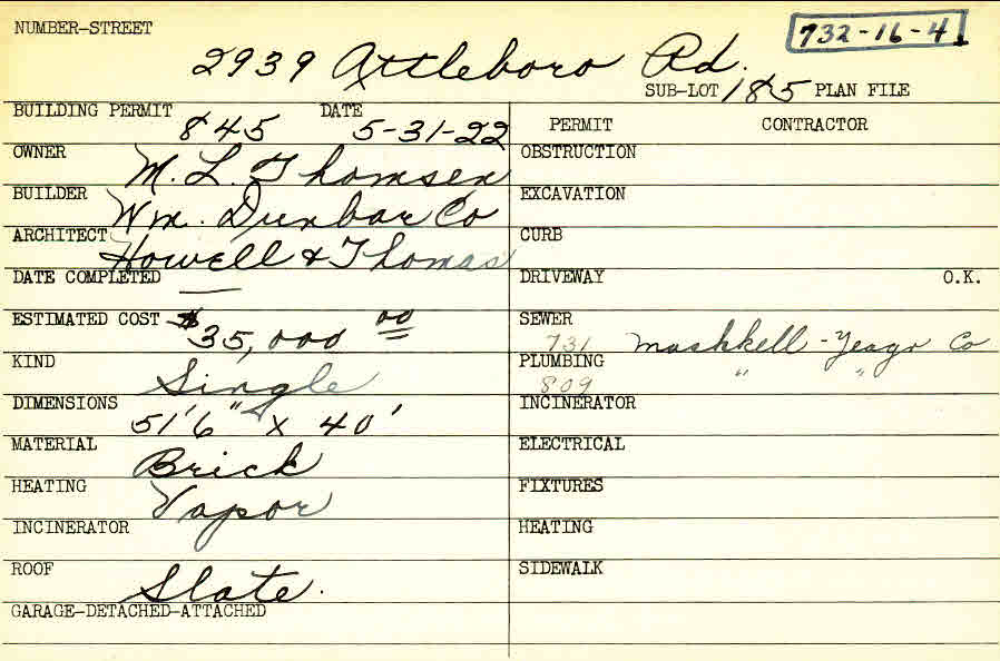 2939 Attleboro Road Shaker Heights, OH 44120 PARCEL ID: 732-16-004 Building Permit Date: 05-31-1922 Plan File Number: 0 Neighborhood: Malvern Owner: Thomsen, M. L. Builder: William Dunbar Company Architect: Howell and Thomas Estimated Cost: 35000 Kind: Single, Single Residence or Dwelling Material: Brick Heating: Vapor Roof: Slate Card Available: yes |