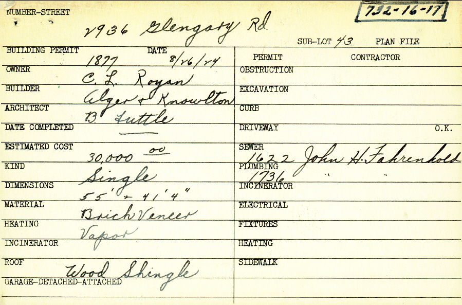 2936 Glengary Road Shaker Heights, OH 44120 PARCEL ID: 732-16-017 Building Permit Date: 08-26-1924 Plan File Number: 6471, 12113 Microfilm Roll: Roll#86, NewRoll#11 Neighborhood: Malvern Owner: Royan, C. L. Builder: Alger and Knowlton Architect: Tuttle, Bloodgood Estimated Cost: 30000 Kind: Single, Single Residence or Dwelling Material: Brick Veneer Heating: Vapor Roof: Wood Shingle |