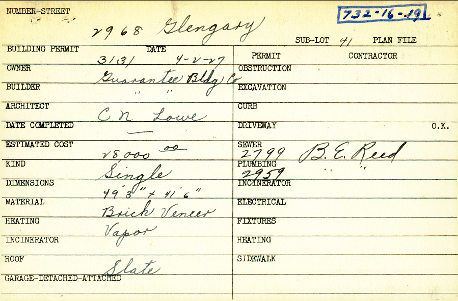 2968 Glengary Road Shaker Heights, OH 44120 PARCEL ID: 732-16-019 Building Permit Date: 04-02-1927 Plan File Number: 5134, 7619 Microfilm Roll: Roll#70, Roll#94 Neighborhood: Malvern Owner: Guarantee Building Company Builder: Guarantee Building Company Architect: Lowe, C. N. Estimated Cost: 28000 Kind: Single, Single Residence or Dwelling Material: Brick Veneer Heating: Vapor Roof: Slate |
