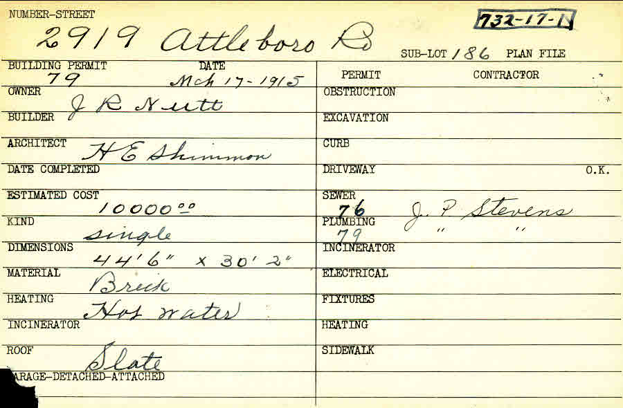 2919 Attleboro Road Shaker Heights, OH 44120 PARCEL ID: 732-17-001 Building Permit Date: 03-17-1915 Neighborhood: Malvern Owner: Nutt, J. R. Architect: Shimmon, H. E. Estimated Cost: 10000 Kind: Single, Single Residence or Dwelling Material: Brick Heating: Hot Water Roof: Slate Blueprints: no blueprints on microfilm |