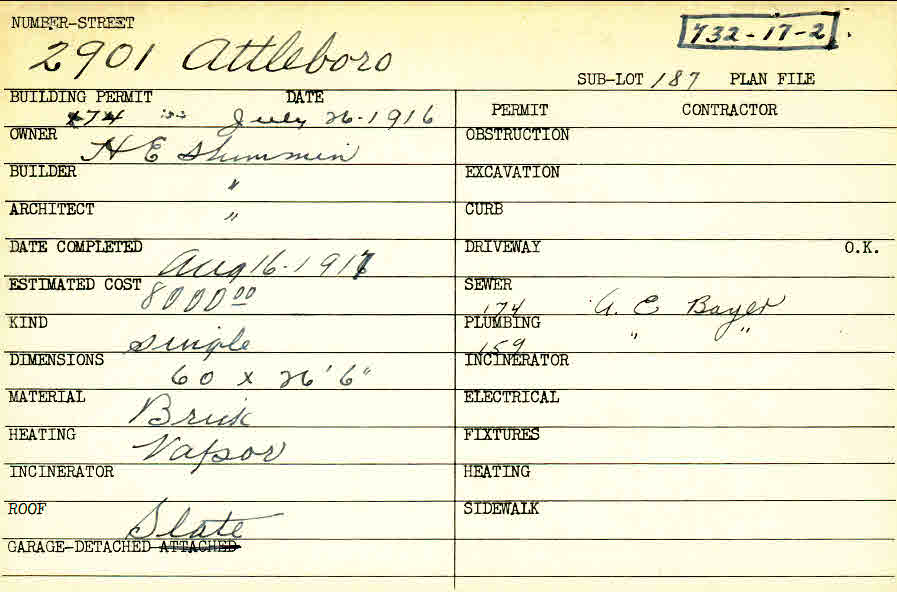 2901 Attleboro Road Shaker Heights, OH 44120 PARCEL ID: 732-17-002 Building Permit Date: 07-26-1916 Plan File Number: 7838 Microfilm Roll: Roll#94 Neighborhood: Malvern Owner: Shimmin, H. E. Builder: Shimmin, H. E. Architect: Shimmin, H. E. Estimated Cost: 8000 Date Completed: 08-16-1917 Kind: Single, Single Residence or Dwelling Material: Brick Heating: Vapor Roof: Slate Garage: detached |