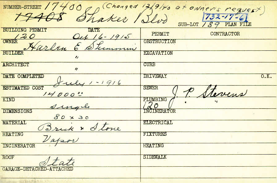 17400 Shaker Boulevard Shaker Heights, OH 44120 PARCEL ID: 732-17-006 Building Permit Date: 10-16-1915 Plan File Number: 0 Neighborhood: Malvern Owner: Shimmin, Harlen E. Builder: Shimmin, Harlen E. Architect: Shimmin, Harlen E. Estimated Cost: 14000 Date Completed: 07-01-1916 Kind: Single, Single Residence or Dwelling Material: Brick and Stone Heating: Vapor Roof: Slate |
