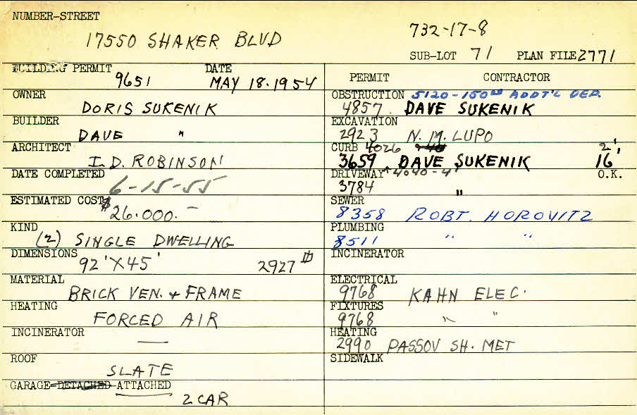 17550 Shaker Boulevard Shaker Heights, OH 44120 PARCEL ID: 732-17-008 Building Permit Date: 05-18-1954 Plan File Number: 2771, 11690, 12529 Microfilm Roll: Roll #38, NewRoll#8, NewRoll#13 Neighborhood: Malvern Owner: Sukenik, Doris Builder: Sukenik, Dave Architect: Robinson, I. D. Estimated Cost: 26000 Date Completed: 06-15-1955 Kind: Single, Single Residence or Dwelling (2) Material: Brick Veneer and Frame Heating: Forced Air Roof: Slate Garage: attached 2 car |