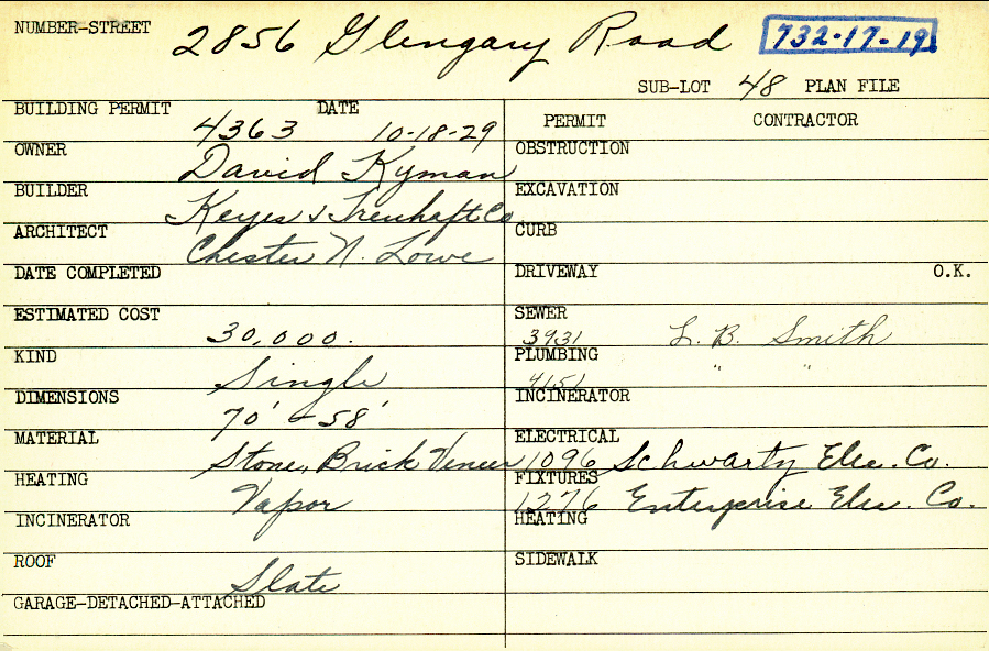 2856 Glengary Road Shaker Heights, OH 44120 PARCEL ID: 732-17-019 Building Permit Date: 10-18-1929 Plan File Number: 0 Neighborhood: Malvern Owner: Kyman, David Builder: Keyes and Treuhaft Company Architect: Lowe, Chester N. Estimated Cost: 30000 Kind: Single, Single Residence or Dwelling Material: Stone, Brick Veneer Heating: Vapor Roof: Slate Card Available: yes |