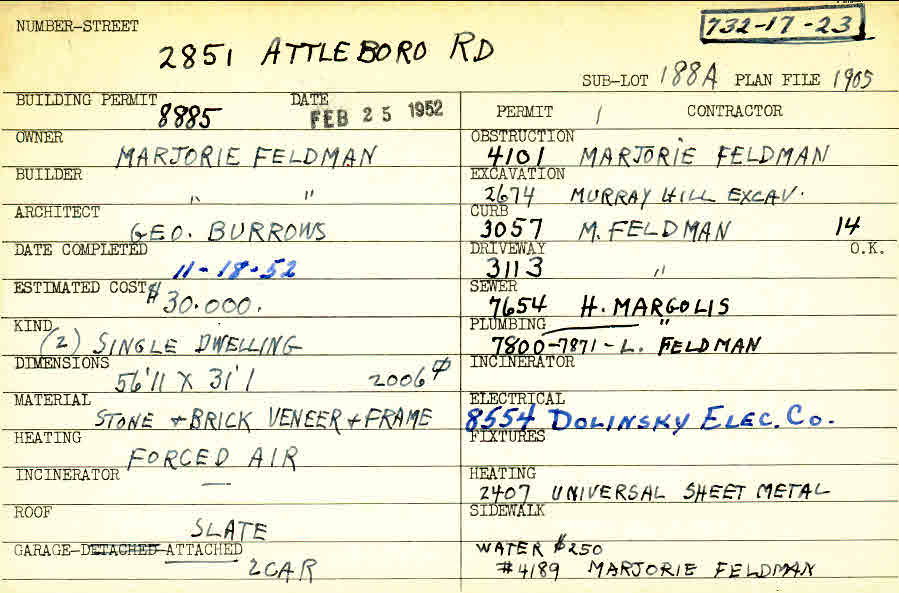 2851 Attleboro Road Shaker Heights, OH 44120 PARCEL ID: 732-17-023 Building Permit Date: 02-25-1952 Plan File Number: 1905 all scanned Microfilm Roll: Roll029 Neighborhood: Malvern Owner: Feldman, Marjorie Builder: Feldman, Marjorie Architect: Burrows, George Estimated Cost: 30000 Date Completed: 11-18-1952 Kind: Single, Single Residence or Dwelling (2) Material: Stone and Brick Veneer and Frame Heating: Forced Air Roof: Slate Garage: attached 2 car |