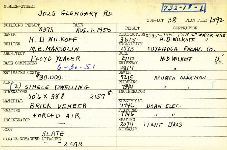 3025 Glengary Road Shaker Heights, OH 44120 PARCEL ID: 732-18-001 Building Permit Date: 08-01-1950 Plan File Number: 1392 all scanned Microfilm Roll: Roll016 Neighborhood: Malvern Owner: Wilkoff, H. D. Builder: Margolin, M. E. Architect: Yeager, Floyd E. Estimated Cost: 30000 Date Completed: 06-30-1951 Kind: Single, Single Residence or Dwelling (2) Material: Brick Veneer Heating: Forced Air Roof: Slate Garage: attached 2 car |
