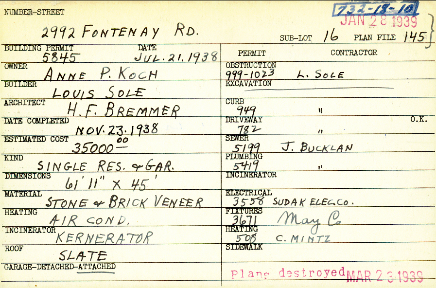 2992 Fontenay Road Shaker Heights, OH 44120 PARCEL ID: 732-18-010 Building Permit Date: 07-21-1938 Plan File Number: 145, 7433, 7435 Microfilm Roll: Roll#93 Neighborhood: Malvern Owner: Koch, Anne P. Builder: Sole, Louis Architect: Bremmer, Harry F. Estimated Cost: 35000 Date Completed: 11-23-1938 Kind: Single Dwelling and Garage Material: Stone and Brick Veneer Heating: Air Conditioned Roof: Slate Garage: attached |