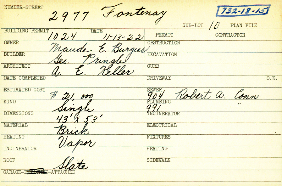 2977 Fontenay Road Shaker Heights, OH 44120 PARCEL ID: 732-18-015 Building Permit Date: 11-13-1922 Neighborhood: Malvern Owner: Burgess, Maude E. Builder: Pringle, George Architect: Keller, Arthur Emil Estimated Cost: 21000 Kind: Single, Single Residence or Dwelling Material: Brick Heating: Vapor Roof: Slate Garage: attached Blueprints: no blueprints on microfilm |