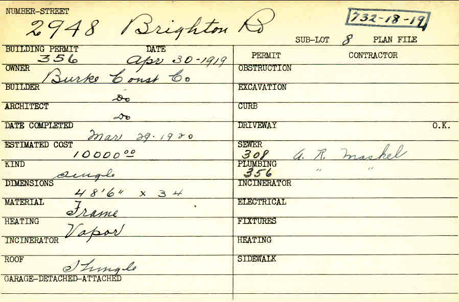 2948 Brighton Road Shaker Heights, OH 44120 PARCEL ID: 732-18-019 Building Permit Date: 04-30-1919 Plan File Number: 0 Neighborhood: Malvern Owner: Burke Construction Company Builder: Burke Construction Company Architect: Burke Construction Company Estimated Cost: 10000 Date Completed: 03-29-1920 Kind: Single, Single Residence or Dwelling Material: Frame Heating: Vapor Roof: Shingles |