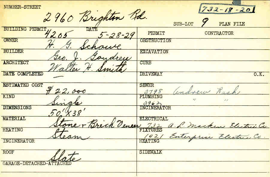 2960 Brighton Road Shaker Heights, OH 44120 PARCEL ID: 732-18-020 Building Permit Date: 05-28-1929 Plan File Number: 0 Neighborhood: Malvern Owner: Schowe, H. G. Builder: Goudreu, George J. Architect: Smith, Walter H. Estimated Cost: 22000 Kind: Single, Single Residence or Dwelling Material: Stone and Brick Veneer Heating: Steam Roof: Slate |