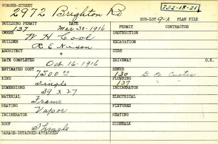 2972 Brighton Road Shaker Heights, OH 44120 PARCEL ID: 732-18-021 Building Permit Date: 03-30-1916 Plan File Number: 0 Neighborhood: Malvern Owner: Cool, W. H. Builder: Nixon, R. E. Architect: Nixon, R. E. Estimated Cost: 7500 Date Completed: 10-16-1916 Kind: Single, Single Residence or Dwelling Material: Frame Heating: Vapor Roof: Shingles |
