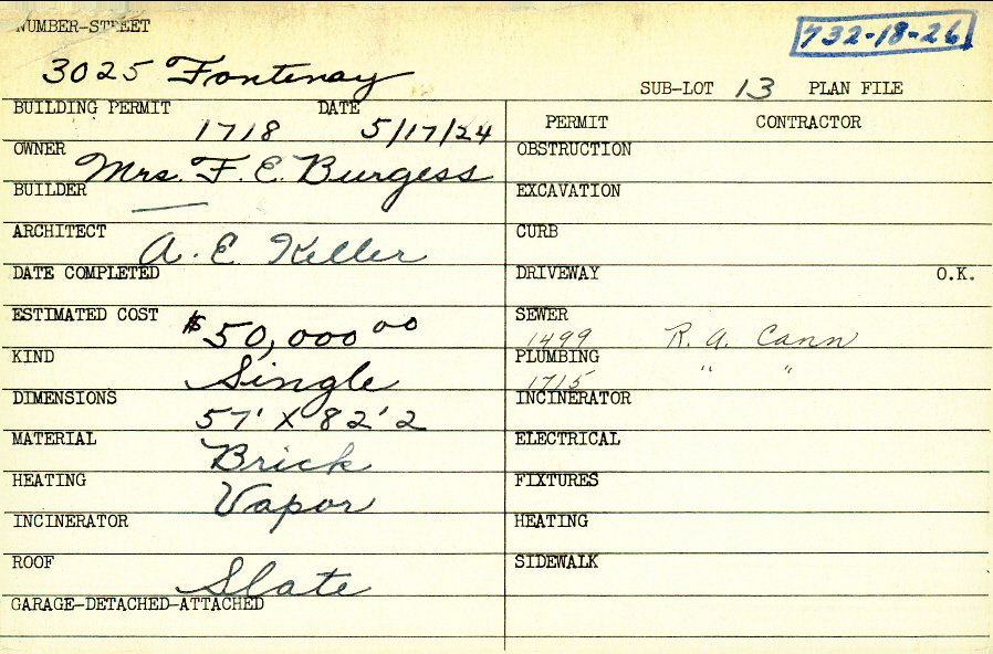 3025 Fontenay Road Shaker Heights, OH 44120 PARCEL ID: 732-18-026 Building Permit Date: 05-17-1924 Neighborhood: Malvern Owner: Burgess, Mrs. F. E. Architect: Keller, Arthur Emil Estimated Cost: 50000 Kind: Single, Single Residence or Dwelling Material: Brick Heating: Vapor Roof: Slate Blueprints: no blueprints on microfilm |