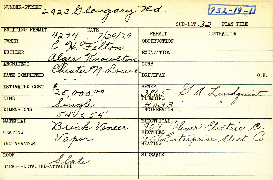 2923 Glengary Road Shaker Heights, OH 44120 PARCEL ID: 732-19-001 Building Permit Date: 07-29-1929 Plan File Number: 4437 Microfilm Roll: Roll#63 Neighborhood: Malvern Owner: Felton, C. H. Builder: Alger-Knowlton Architect: Lowe, Chester N. Estimated Cost: 25000 Kind: Single, Single Residence or Dwelling Material: Brick Veneer Heating: Vapor Roof: Slate |