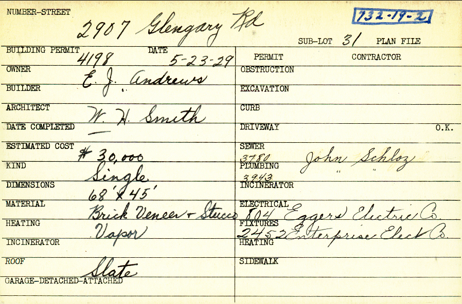 2907 Glengary Road Shaker Heights, OH 44120 PARCEL ID: 732-19-002 Building Permit Date: 05-23-1929 Plan File Number: 0 Neighborhood: Malvern Owner: Andrews, E. J. Builder: Andrews, E. J. Architect: Smith, W. H. Estimated Cost: 30000 Kind: Single, Single Residence or Dwelling Material: Brick Veneer and Stucco Heating: Vapor Roof: Slate Card Available: yes |