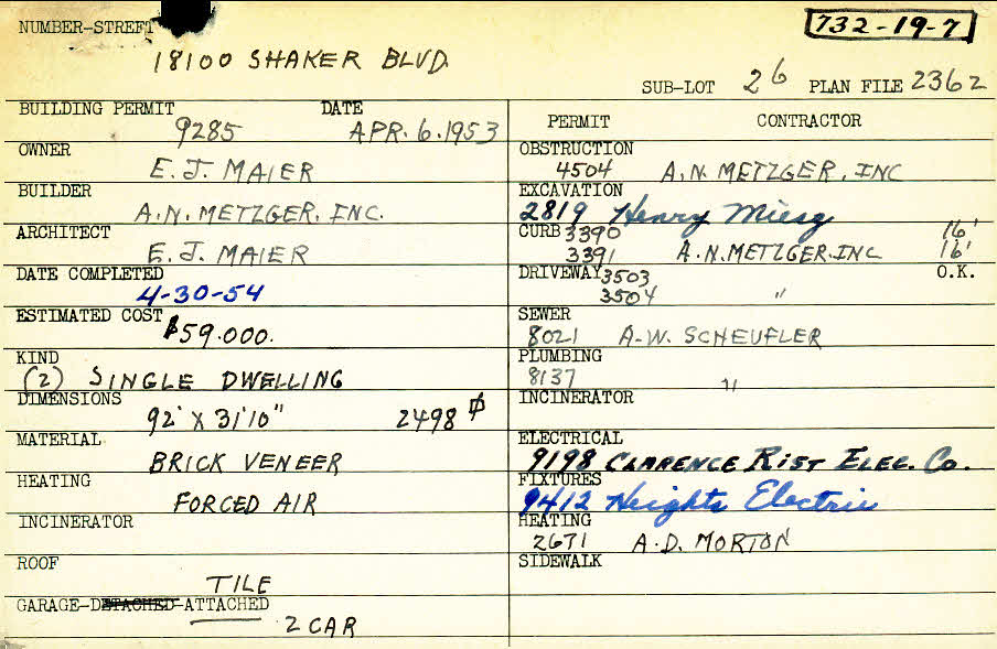 18100 Shaker Boulevard Shaker Heights, OH 44120 PARCEL ID: 732-19-007 Building Permit Date: 04-06-1953 Plan File Number: 2362, 11632, 12866 Microfilm Roll: NewRoll#8, NewRoll#18 Neighborhood: Malvern Owner: Maier, E. J. Builder: A. N. Metzger, Inc. Architect: Maier, E. J. Estimated Cost: 59000 Date Completed: 04-30-1954 Kind: Single, Single Residence or Dwelling (2) Material: Brick Veneer Heating: Forced Air Roof: Tile Garage: attached 2 car |