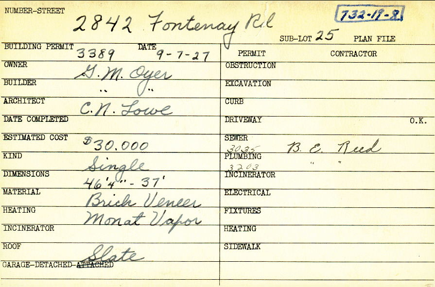2842 Fontenay Road Shaker Heights, OH 44120 PARCEL ID: 732-19-008 Building Permit Date: 09-07-1927 Plan File Number: 0 Neighborhood: Malvern Owner: Oyer, G. M. Builder: Oyer, G. M. Architect: Lowe, C. N. Estimated Cost: 30000 Kind: Single, Single Residence or Dwelling Material: Brick Veneer Heating: Vapor Roof: Slate Garage: detached Card Available: yes |