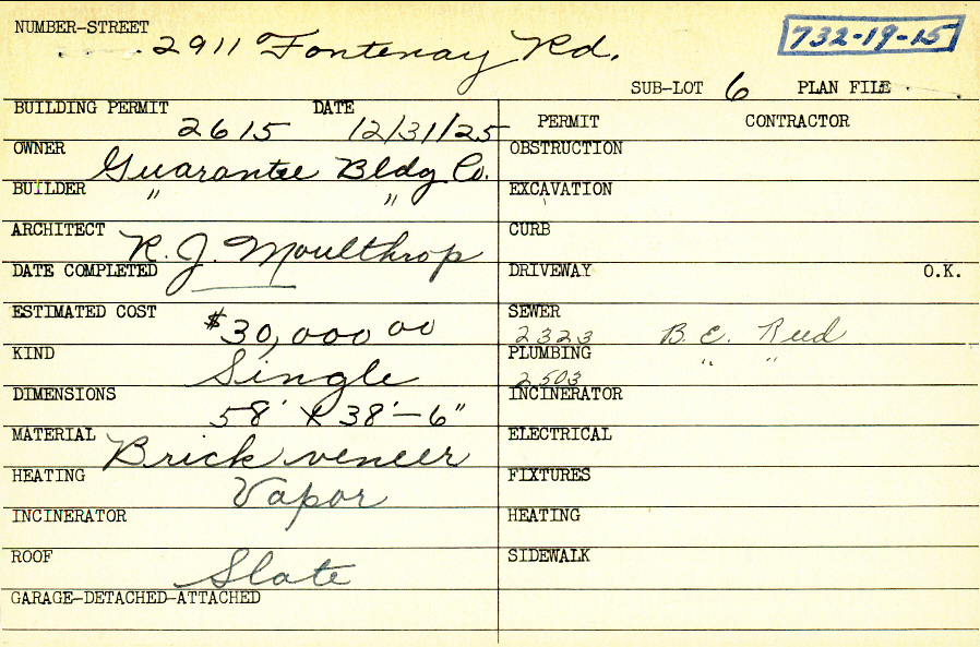 2911 Fontenay Road Shaker Heights, OH 44120 PARCEL ID: 732-19-015 Building Permit Date: 12-31-1925 Plan File Number: 4335 scanned, 92-127 Microfilm Roll: Roll062, NewRoll#1 Neighborhood: Malvern Owner: Guarantee Building Company Builder: Guarantee Building Company Architect: Moulthrop, R. J. Estimated Cost: 30000 Kind: Single, Single Residence or Dwelling Material: Brick Veneer Heating: Vapor Roof: Slate |