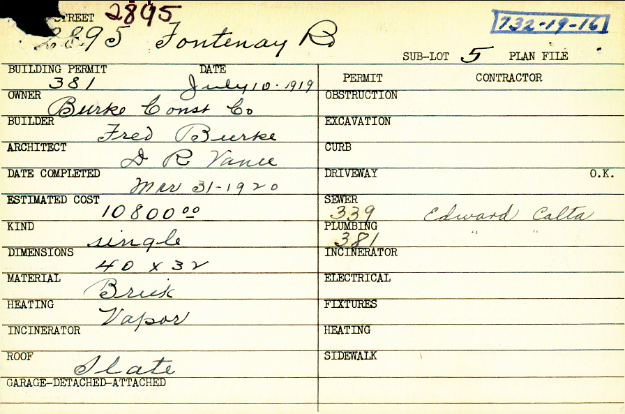 2895 Fontenay Road Shaker Heights, OH 44120 PARCEL ID: 732-19-016 Building Permit Date: 07-10-1919 Plan File Number: 485 scanned, 1893 scanned, 2614, 4792, 5593, 10402 Microfilm Roll: Roll005, Roll029, Roll #36, Roll#66, Roll#76, NewRoll#4 Neighborhood: Malvern Owner: Burke Construction Company Builder: Burke, Fred Architect: Vance, D. R. Estimated Cost: 10800 Date Completed: 03-31-1920 Kind: Single, Single Residence or Dwelling Material: Brick Heating: Vapor Roof: Slate |