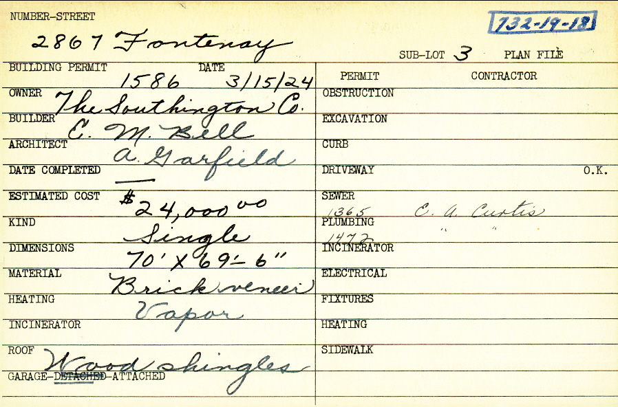 2867 Fontenay Road Shaker Heights, OH 44120 PARCEL ID: 732-19-018 Building Permit Date: 03-15-1924 Plan File Number: 0 Neighborhood: Malvern Owner: The Southington Company Builder: Bell, E. M. Architect: Garfield, A. Estimated Cost: 24000 Kind: Single, Single Residence or Dwelling Material: Brick Veneer Heating: Vapor Roof: Wood Shingle Garage: attached Card Available: yes |