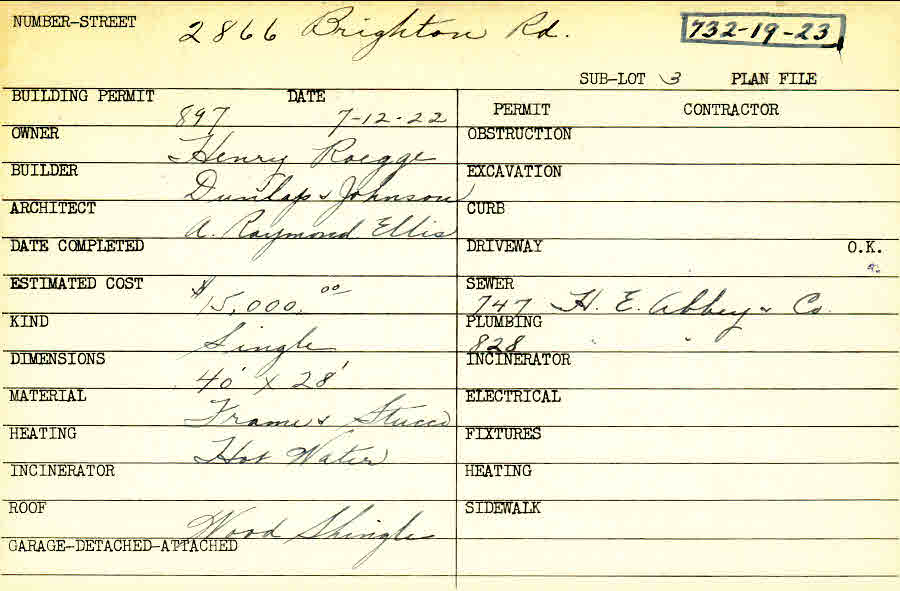 2866 Brighton Road Shaker Heights, OH 44120 PARCEL ID: 732-19-023 Building Permit Date: 07-12-1922 Plan File Number: 0 Neighborhood: Malvern Owner: Roegge, Henry Builder: Dunlap and Johnson Architect: Ellis, A. Raymond Estimated Cost: 15000 Kind: Single, Single Residence or Dwelling Material: Frame and Stucco Heating: Hot Water Roof: Wood Shingle |
