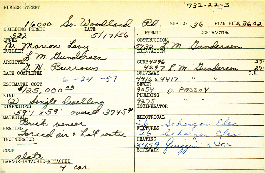 16000 South Woodland Road Shaker Heights, OH 44120 PARCEL ID: 732-22-003 Building Permit Date: 05-17-1956 Plan File Number: 3602, 7106 Microfilm Roll: Roll#91 Neighborhood: Boulevard Owner: Levy, Mr. Marion Builder: Gundersen, L. M. Architect: Burrows, G. H. Estimated Cost: 125000 Date Completed: 06-24-1957 Kind: Single, Single Residence or Dwelling (2) Material: Brick Veneer Roof: Slate Garage: attached |